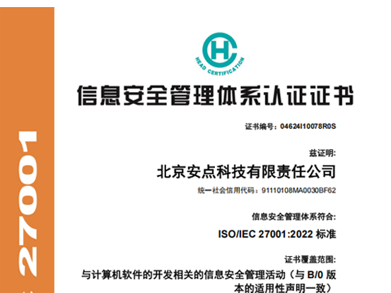 近日,北京安点科技有限责任公司(以下简称 “安点科技”)顺利通过国际权威认证机构的全面审核,成功完成 ISO 9001 质量管理体系与 ISO 27001 信息安全管理体系的证书更新。此次双证同步续期,不仅标志着安点科技在质量管理规范化与信息安全防护专业化方面持续符合国际标准,更彰显了企业对核心资质建设的长期重视与不懈投入。